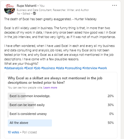 I ran a poll on LinkedIn a few days back to see which was the most plausible reason behind, Excel is not mentioned as require skill set is not always mentioned in job descriptions/or tested prior hire, even when Excel knowledge is needed to do the job and the results are shown in the screenshot as follows.